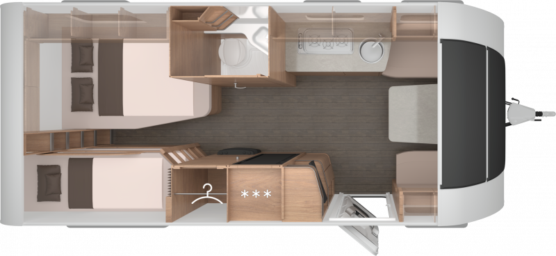 580 UK är planlösningen som passar familjen som söker både funktion och mysfaktor. Barnens våningssäng längst bak ger dem en egen liten hörna som är perfekt för lek eller filmmys. Längst fram i husvagnen hittar vi en rymlig sittgrupp för mat och mys.