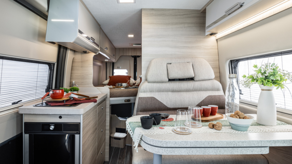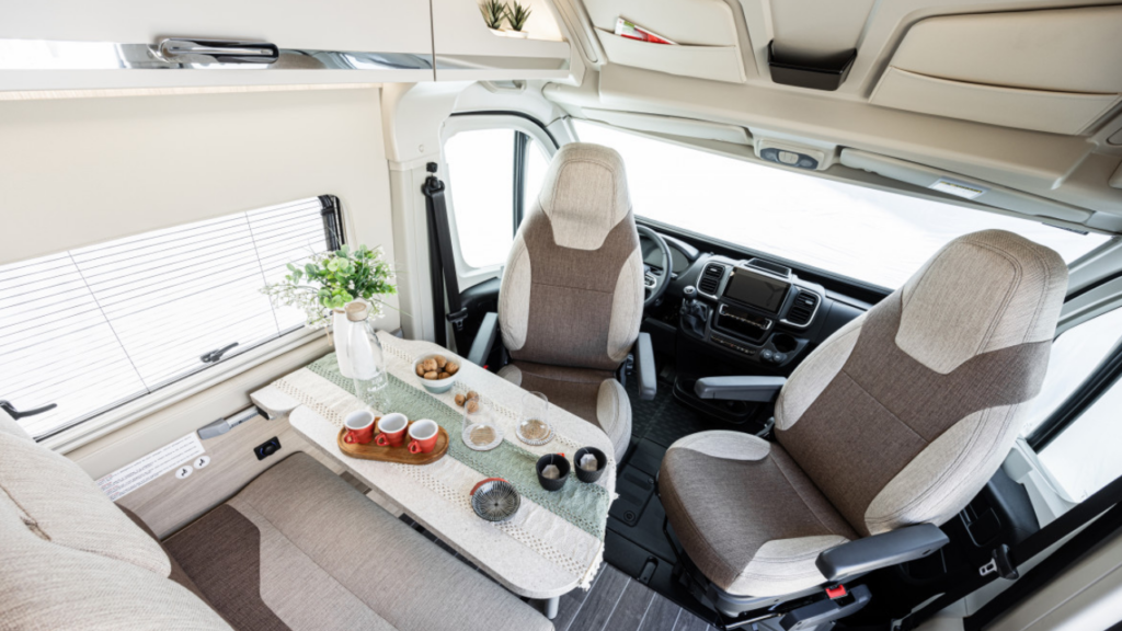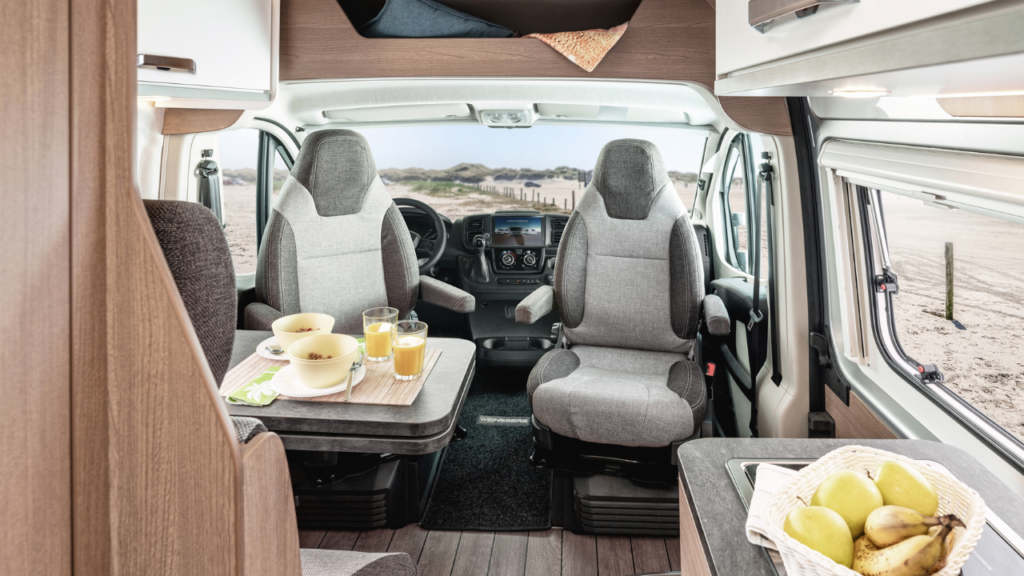 Inne i bodelen infinner sig en lugn, harmonisk känsla. Den stilrena klädseln i Natural Stone skapar en mjuk, modern atmosfär, medan den integrerade bäddmadrassen bjuder in till riktig skönhetssömn, oavsett var du har parkerat för natten. Och med möjlighet till elektrisk säng bak förvandlar du enkelt utrymmet efter dagens behov – från social yta till plats för vila, eller rum för extra last när resan kräver det.