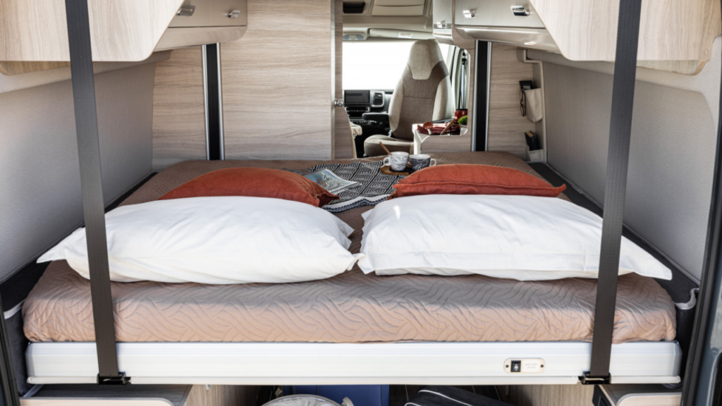 Längst bak hittar du en elektrisk lyftsäng som gör det enkelt att växla mellan sovrum och förvaring beroende på vad dagen kräver. Och just flexibiliteten är en röd tråd genom hela bilen. Till exempel finns också tillvalet pop-up-tak för den som önskar ytterligare ett par sovplatser.