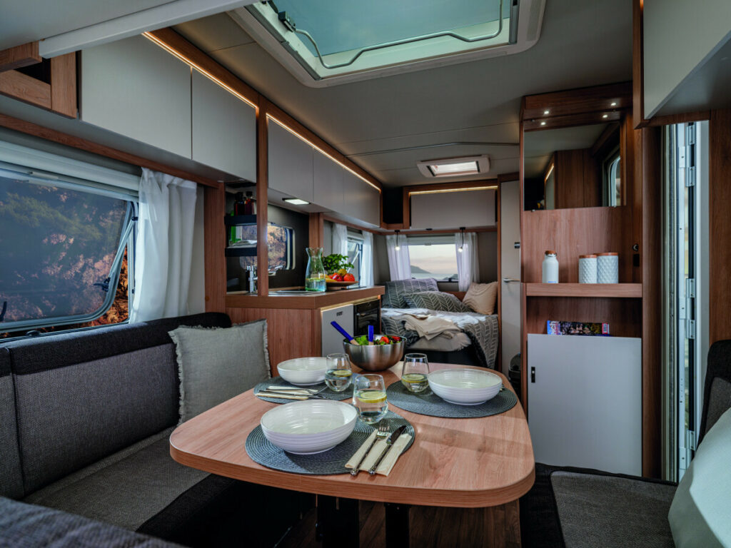Den familjevänliga planlösningen skapar en naturlig uppdelning mellan sovplatser och umgängesytor, vilket ger både lugn och plats för gemenskap. Samtidigt bidrar smart förvaring, genomtänkta detaljer och funktionella lösningar till att vardagen på resande fot flyter på smidigt. Resultatet är en trivsam och praktisk husvagn som gör det enkelt att njuta av livet på vägarna.